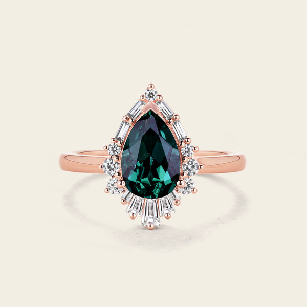 Baguette Art deco Halo Lab Emerald Engagement Ring Pear Cut