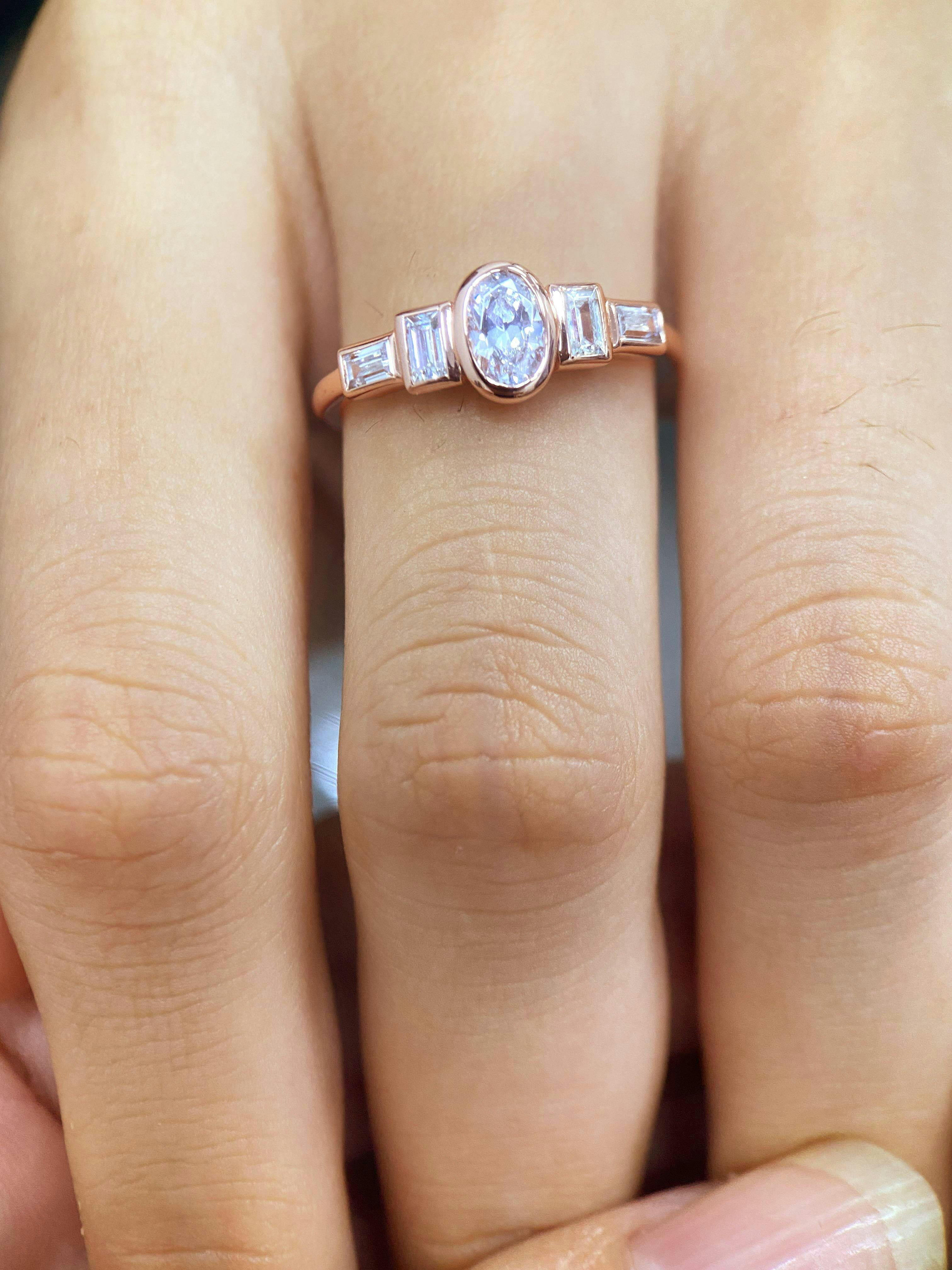 Oval Moissanite Bezel Set Engagement Ring Art Deco Rose Gold